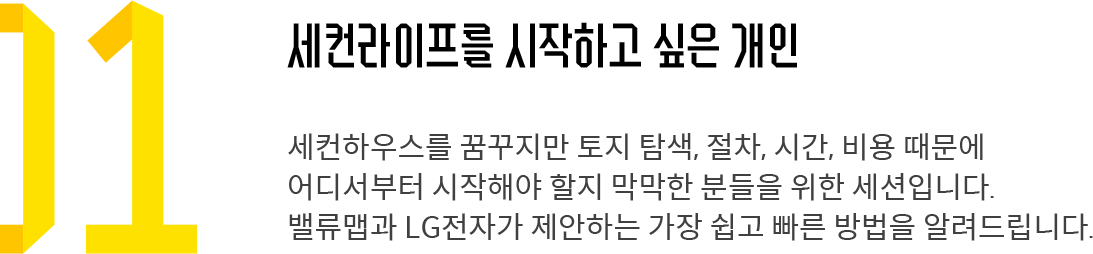 이번 세미나에서는 밸류맵이 제안하는 새로운 토지·구매 방식과 LG 스마트코티지를 통해 세컨라이프를 가장 빠르게 실현하는 방법을 소개합니다.